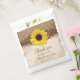 Rustic burlap, lace, and wood yellow sunflower wedding favour bags. This unique rustic sunflower wedding bag design features a bright yellow sunflower, a burlap and lace look background, and a wood and leather look emblem under the sunflower. A pretty design for a summer or fall / autumn wedding. It can work for rustic, barn, farm, western, or country style weddings. There are a lot of subtle details in the design. Browns, yellows, beige are the prominent colours.