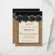 This modern and trendy rustic brown FAUX burlap look wedding reply card is shown here on basic paper. It has a PRINTED black lace band with a PRINTED bow on it, and an ivory and black edged template text area on it that matches the wedding invitation shown below. It is easily customised with your own information. ***PLEASE be careful if you change the paper type. ***PLEASE NOTE that if you change the fonts, or the size of the font, some of your text may get cut-off. Everything will print as it appears on your monitor. I will NOT see your order and Zazzle will NOT edit or correct anything, so please be sure you have no typos or mis-aligned text. If you need assistance, please email me BEFORE you place your order. If you need this formatted for a different event, or if there are any other matching items you need to make your event extra special, please email your request to niteowlstudio@gmail.com. Existing matching items are shown below.