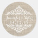 This rustic, vintage wedding sticker features a delicate white damask embellishment on a burlap look background. Perfect for a rustic, vintage, or country themed wedding.