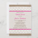 The design features a lovely rustic burlap effect background with a romantic vintage white lace and pink ribbon effect trim.