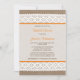 The design features a lovely rustic burlap effect background with a romantic vintage white lace and orange ribbon effect trim.