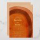 Boho wedding invitation with an abstract arch painted in earthy desert colours of burnt orange, terracotta, rust and brown. Your wedding details are in a modern layout along with your names in a retro style font for a fun twist. All text is printed with real gold foil.