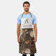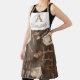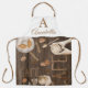 This charming custom apron features a café shop theme with coffee drinkers sitting together at a rustic wooden table. The bottom portion features a wood background with various café style images. The images are printed in watercolor painting style, warm and rustic design. Pastries with cutlery, cinnamon sticks and coffee beans are placed across the table. A sample name and monogram initial are printed in a beige font over the top portion.