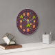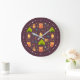 A clock with a fun camping themed pattern. Set on a reddish brown background. Elements in the pattern include a campfire, a tent,. a guitar, a shovel and backpack.