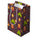 Gift bags with a fun camping themed pattern. Set on a reddish brown background. Elements in the pattern include a campfire, a tent,. a guitar, a shovel and backpack.