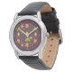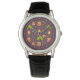 A watch with a fun camping themed pattern. Set on a reddish brown background. Elements in the pattern include a campfire, a tent,. a guitar, a shovel and backpack.