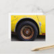 Revive the charm of classic automobiles with this stunning postcard featuring a close-up of a vintage yellow car. The vibrant yellow paint, adorned with characterful wear and tear, tells a story of nostalgia and adventure. The intricate wire-spoked wheel, highlighted by its rustic patina, adds a touch of elegance to this timeless piece.