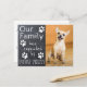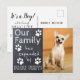 Rustic chalkboard photo pet announcement featuring 4 white paws on the front of the card. The text reads "Our family has expanded by four feet". The inside features details about your new furry friend.