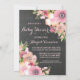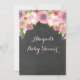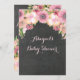 Personalised baby shower invitations with rustic country chalkboard pattern and pretty pink watercolor vintage flowers. Perfect for a spring or summer baby shower.