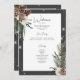 This wedding program design features a rustic green pine and pinecone bouquet on a soft charcoal black background with white flowers. It is accented with a white sparkle overlay to illustrate the magic of the beautiful winter holidays. Perfect for a Christmas or winter wedding. Created by Simply Farmhouse Press.