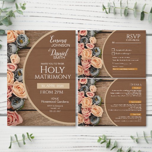 Invite your loved ones with the Rustic Charm Holy Matrimony Wedding Invitation, beautifully designed with woodgrain textures, pastel roses, and succulents in soft peach, pink, and gray-blue tones. This invitation blends rustic warmth with romantic elegance, making it perfect for barn weddings, countryside celebrations, or outdoor ceremonies. Coordinated with the Rustic Charm suite, it reflects love rooted in nature and tradition while offering a cozy, handcrafted aesthetic.