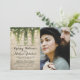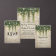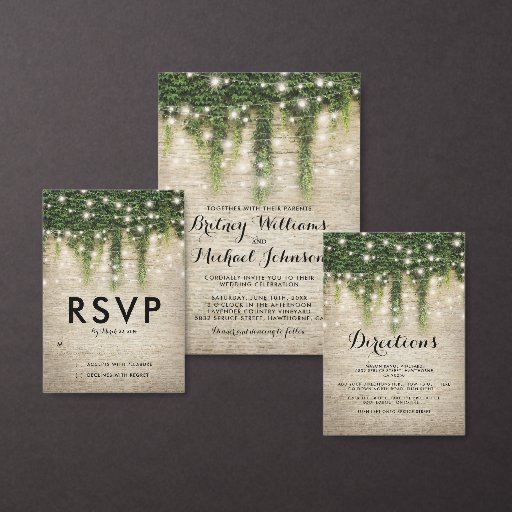 Magical fairytale wedding invitations featuring a rustic stone brick wall background, a photo of the engaged couple, green ivy vine, sparkling twinkle string lights, and a modern wedding template.