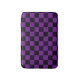 This moody bath mat features a pattern of rustic checks, checkers that are distressed in purple and black.