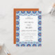 Beautiful blue and rust geometric Spanish tile frame pattern, wedding invitation. Back of invitation features solid trendy rust colour. Font styles and colour can be customised.