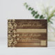 Gold damask contrasts beautifully with the dark rustic barn wood on the country rustic chic wedding response card. Bride and groom's names and wedding date on reverse side completes the beautiful rustic elegance look.