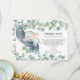 Co-ordinate your baby shower with these chic greenery elephant baby shower thank you card. Featuring rustic watercolor eucalyptus leaves and a cute sleeping baby elephant. Personalise it with your own wordings easily and quickly, simply press the customise it button to further re-arrange and format the style and placement of the text. Check out the matching items for this collection available in store! (c) The Happy Cat Studio