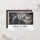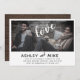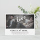 This black and white modern Rustic Chic Wood Photo Engagement Party Invite features your engagement photo (horizontal / landscape orientation) behind a white overlay photo frame. There is a special effect put on the photo to make it de-saturated, but if you prefer you can click 'customise' and toggle the effect off. The word 'Love' appears on the diagonal as a white script typography overlay on your photo, which you can re-position according to your needs using the 'customise' feature. The names, date, location and RSVP details appear on the white photo frame below the image. The back of the card features a rustic wooden wall design. CREATOR'S NOTE: The "vellum overlay" on this product is a digital effect." Contact designer for matching products. Copyright Anastasia Surridge for Anastasia Designs, all rights reserved.