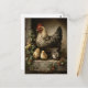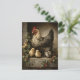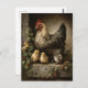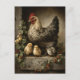 A beautifully detailed fine art painting of a mother hen proudly watching over her three chicks, set in a weathered wooden frame adorned with rosebuds and berries. This heartwarming farmyard portrait captures the tenderness of motherhood and the rustic charm of country life.