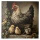 A beautifully detailed fine art painting of a mother hen proudly watching over her three chicks, set in a weathered wooden frame adorned with rosebuds and berries. This heartwarming farmyard portrait captures the tenderness of motherhood and the rustic charm of country life.