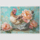 Bring farmhouse elegance to your crafting projects with this captivating decoupage tissue paper design. It features a golden-brown chicken resting in a vintage wire basket lined with delicate white lace, surrounded by lush coral peonies. The serene turquoise floral background adds a touch of charm and sophistication, making this design perfect for weddings, rustic-themed events, gift wrapping, or DIY crafts. A blend of country warmth and artistic detail, this unique tissue paper is an ideal choice for adding a luxurious and personalised touch to any project.