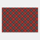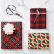 This set of three rustic Christmas wrapping paper sheets includes three festive holiday plaid patterns; a traditional red, white, gold, and black tartan plaid, a classic lumberjack-style red and black Buffalo Plaid, and a fun pattern of angled Christmas trees in red and green Buffalo plaid patterns over a retro-inspired yellow/tan background.