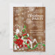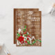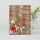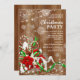 Rustic christmas holiday party invitation, featuring a dark wooden background, a bouquet of xmas red poinsettia flowers, sweet colorful red & green candy canes, fir cones, white foliage, delicate white snowflakes and festive ribbon. The background is created using transparent overlay circles creating a wintery snowy affect and a modern template that is easy to customize.