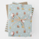 This whimsical Christmas wrapping paper set features three different designs. The first unique design features a winter polar bear with a neutral blue background and stars and snowflakes. The second wrapping design features modern blue stripes, and the third features an elegant snow pattern on brown kraft-style paper. The perfect winter wrapping design for your gifts this holiday season.