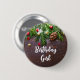 Birthday girl button with a rustic photograph of a brown wooden table with pinecones, pine needles, snow, and Christmas ornaments. Festive and lovely.