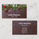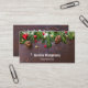 Business cards with a rustic photograph of a brown wooden table with pinecones, pine needles, snow, and Christmas ornaments. Festive and lovely.