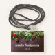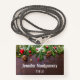 A name tag with a rustic photograph of a brown wooden table with pinecones, pine needles, snow, and Christmas ornaments. Festive and lovely.