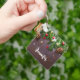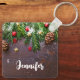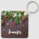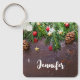 A key chain with a rustic photograph of a brown wooden table with pinecones, pine needles, snow, and Christmas ornaments. Festive and lovely.