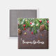 Magnet with a rustic photograph of a brown wooden table with pinecones, pine needles, snow, and Christmas ornaments. Festive and lovely.