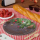 Paper plates with a rustic photograph of a brown wooden table with pinecones, pine needles, snow, and Christmas ornaments. Festive and lovely.