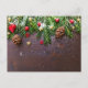 A postcard with a rustic photograph of a brown wooden table with pinecones, pine needles, snow, and Christmas ornaments. Festive and lovely.