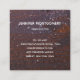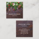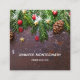 A business card with a rustic photograph of a brown wooden table with pinecones, pine needles, snow, and Christmas ornaments. Festive and lovely.