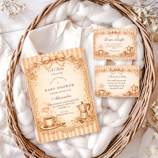 Celebrate a sweet new arrival with this vintage-inspired coffee baby shower design, featuring hand-drawn espresso details, warm sepia tones, and an elegant storybook frame. The cozy café aesthetic is perfect for a relaxed, intimate gathering with a timeless European feel. Ideal for coffee lovers, neutral baby showers, and classic celebrations with a warm, nostalgic charm.