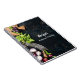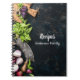 A cookbook notebook for your favourite family recipes. Fresh food, herbs, basil onions, a wooden cutting Board a herbal chopper on a painter's dark rustic canvas with paint stains. Template for your text and family name.