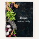 A cookbook notebook for your favourite family recipes. Fresh food, herbs, basil onions, a wooden cutting Board a herbal chopper on a painter's dark rustic canvas with paint stains. Template for your text and family name.