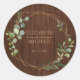 Rustic, modern, and trendy, this classic round wedding sticker design features a faux copper geometric embellished with watercolor eucalyptus greenery, over a warm barn wood texture. The couple's names and wedding date are in a matching copper colour. Part of a matching set. Copyright Elegant Invites. All rights reserved.