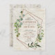 Modern and trendy, this postcard wedding invitation design features a faux copper geometric embellished with watercolor eucalyptus greenery, over a faux white birch bark texture. The couple's names and some wedding details are in a matching copper colour, and the back of the postcard features a stand of birch trees. Copyright Elegant Invites. All rights reserved.