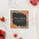 Rustic harvest wedding napkins featuring a country chic wooden background, black chalkboard centrepiece, rope, halloween pumpkins, fall foliage, acorns, a scattering of autumn leaves, string twinkle lights and a personalised text template.