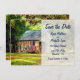 This Save the Date wedding announcement features a rustic barn with a patriotic American flag and the word Love in a charming wooded country setting.