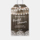 Rustic bridal shower thank you gift tags featuring a country barn oak barrel background, twinkle string lights, baby's breath, your initials, and a thank you template that is easy to personalise.