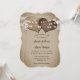 Rustic country burlap and lace wedding invitation featuring two burlap hearts and string lights against a hessian background adorned with lace. Ideal card design for your country-themed wedding party. Matching items available.