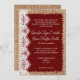 This rustic wedding invitation is perfect for any country western wedding. It features a rustic country printed burlap background on both sides of the invitation. The invitation lettering is printed on an tattered maroon red rectangle with a printed lace embellishment on the side. The burlap and the lace are just printed designs. It is not actual burlap fabric or actual lace.