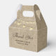 Rustic country wedding thank you favour box featuring string lights on a lights burlap background.