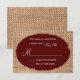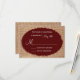 This rustic wedding invitation is perfect for any country wedding. It features a rustic printed burlap background. The lettering on top of a red maroon oval that has tattered edges. Perfect for a country or barn wedding. Just add your RSVP date to the card. The burlap is just a printed design. It is not actual burlap fabric.