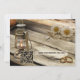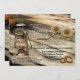 Engagement party invitation in a country style with a rustic wood table with lantern, rings and daisy flowers.