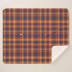 Rustic farmhouse style fall plaid sherpa fleece blanket in hues of burnt orange, dark blue, reds, and yellow.