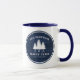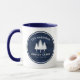 Stylish, country rustic themed coffee mugs, featuring your name and "Family Cabin", Ranch, Cottage or other text along with its established date and location if desired. This custom, unique design features rustic country style text with a white silhouette of pine trees on a round print of wood planks in rich blue colours. To see more designs like this, feel free to visit my store here at "Zazzle.com/Rustic_Charm". Thanks.